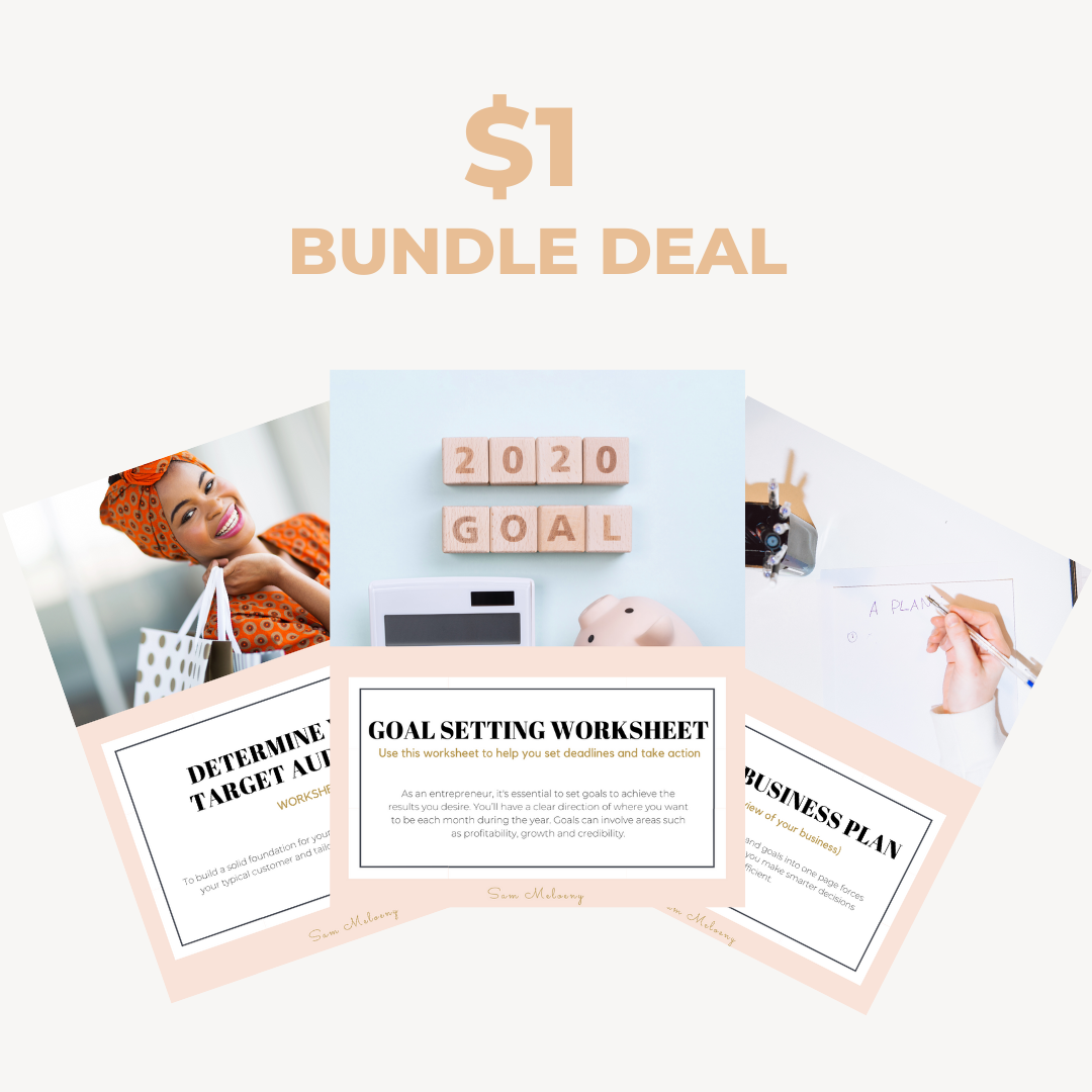 The bundle includes a Goal Setting Worksheet, a One Page Business Plan and a Target Audience Worksheet.
